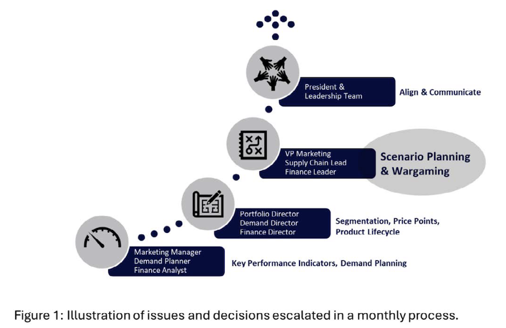 Now contrast this with the approach used at a consumer goods company, illustrated in Figure 1, where the monthly conversation happens in the following sequence: